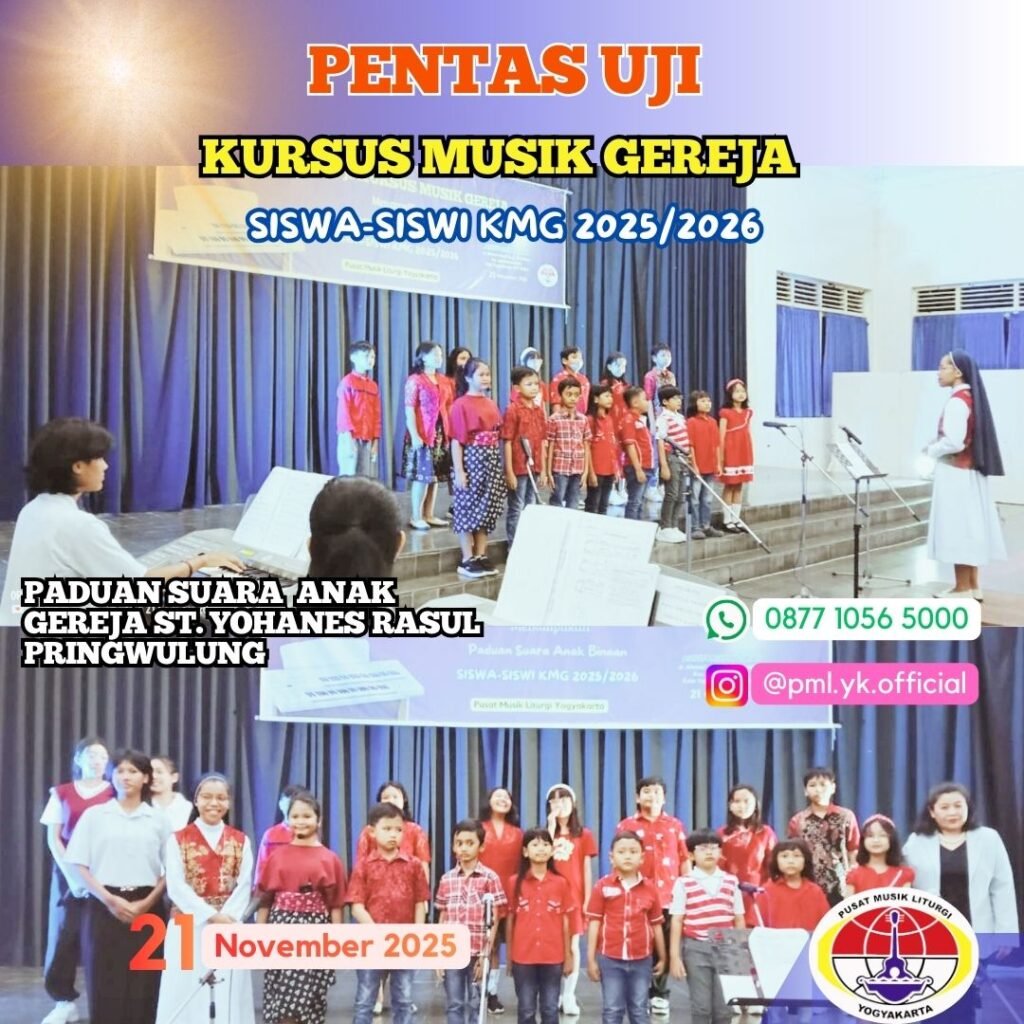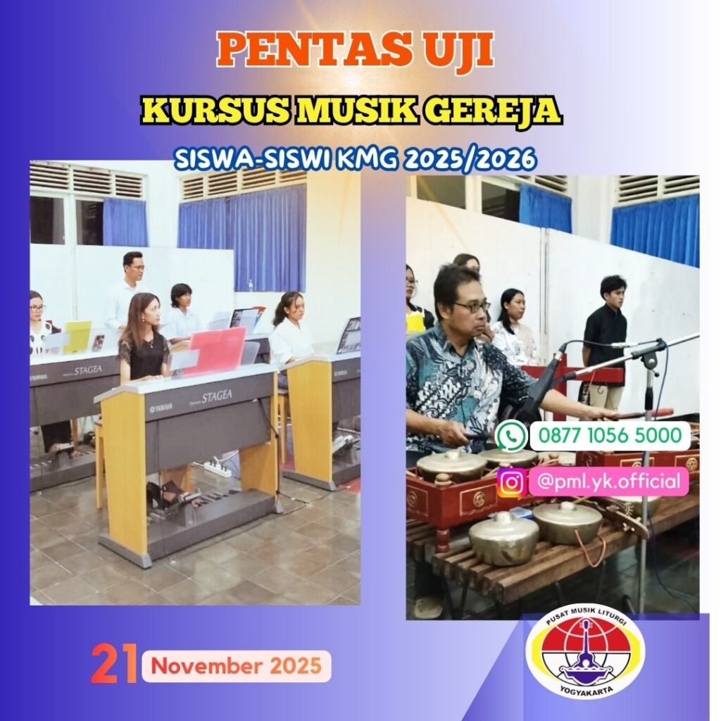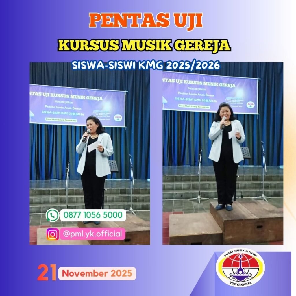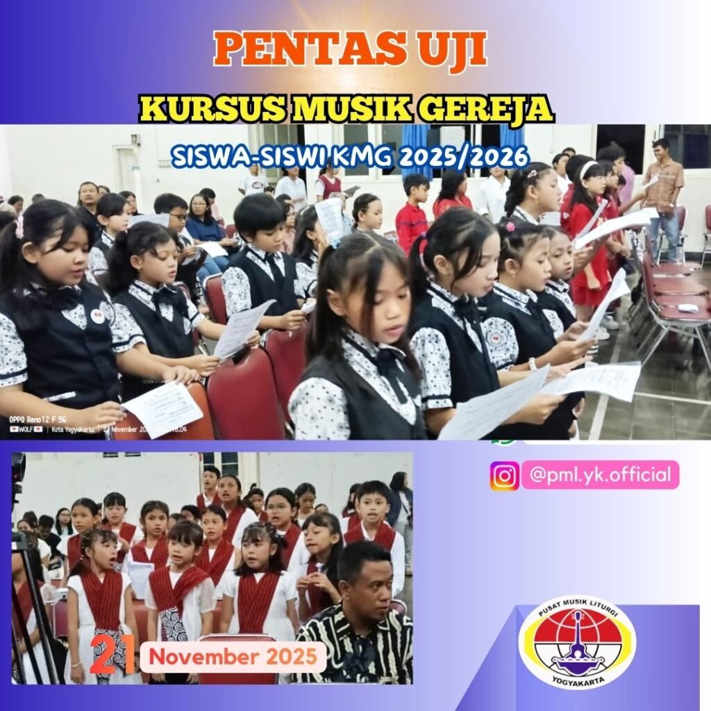 Bertempat di Auditorium Gedung Puskat Jl. Ahmad Jazuli 2 Yogyakarta, Jumat 21 November 2025 diadakan pentas uji para siswa KMG. Pentas ini guna menguji kemampuan siswa sesudah belajar selama tiga bulan. Dalam pentas kali ini siswa kursus, harus dapat membina murid SD wilayah sekitar Yogyakarta yang telah dipilih, untuk dilatih kor oleh para siswa Kursus Musik Gereja (KMG) dengan dua lagu yang telah disiapkan. Hasil pendampingan dengan siswa SD tadi untuk dipentaskan di depan penonton sebagai bahan untuk penilaian siswa KMG di Triwulan pertama.