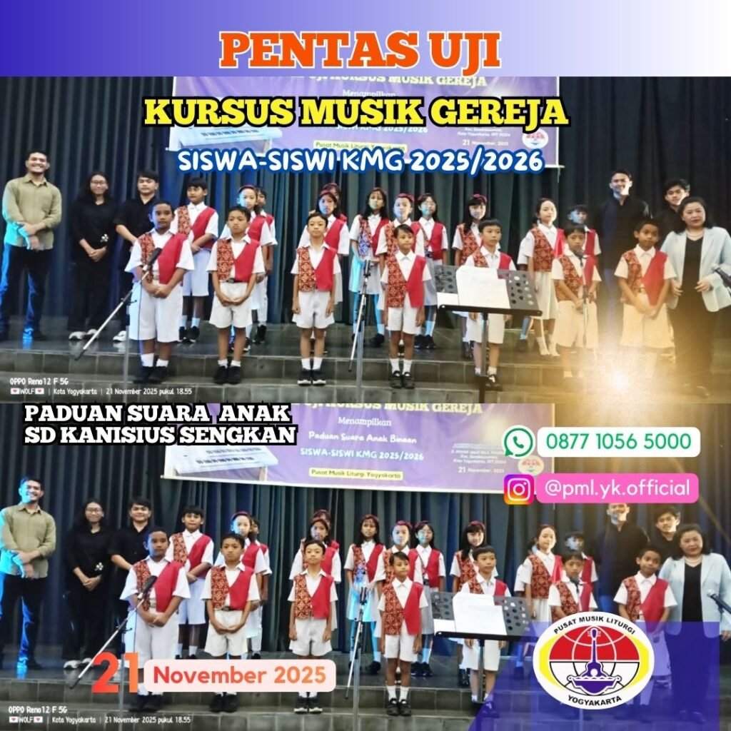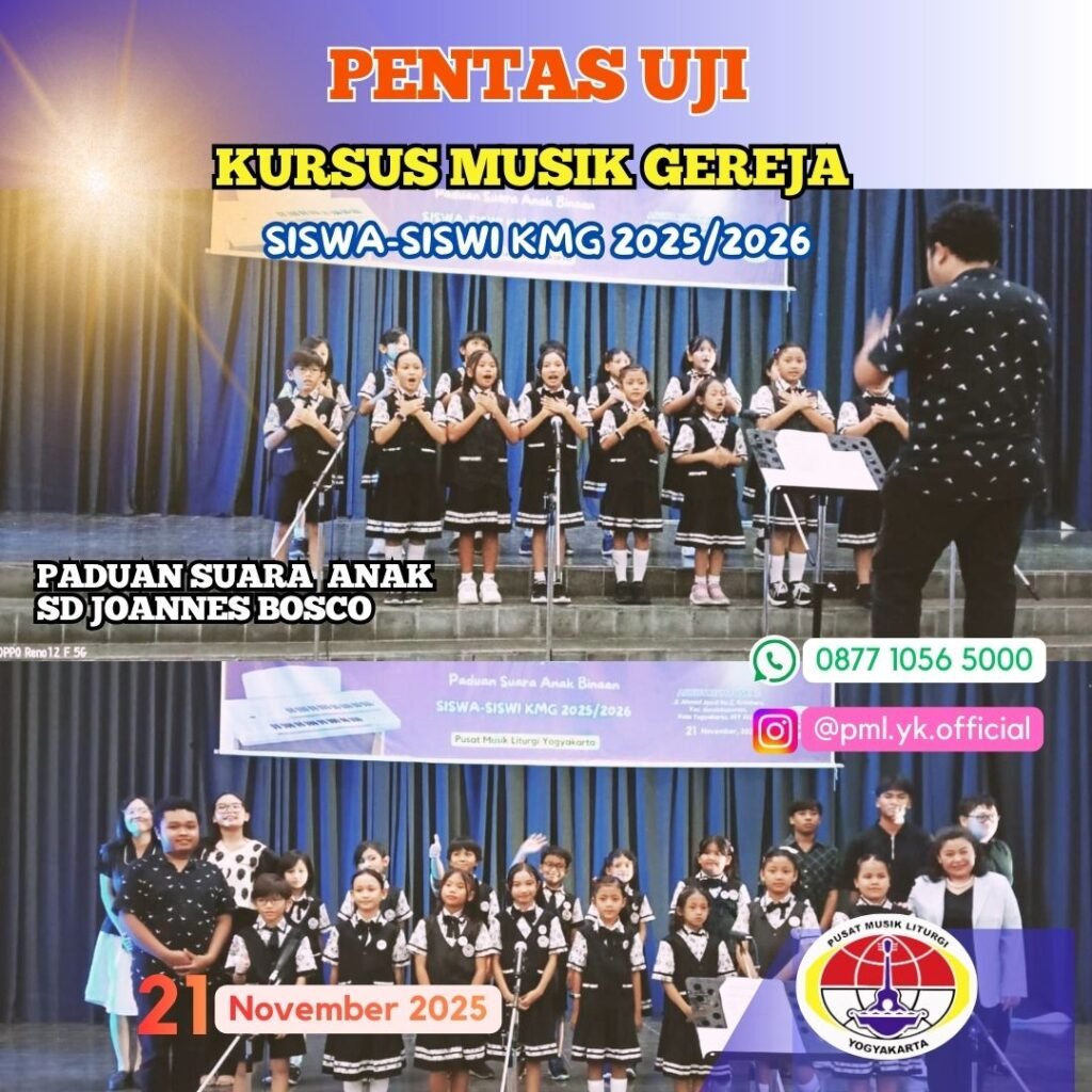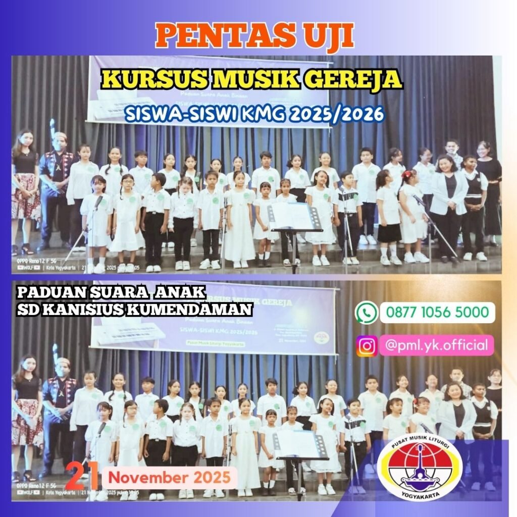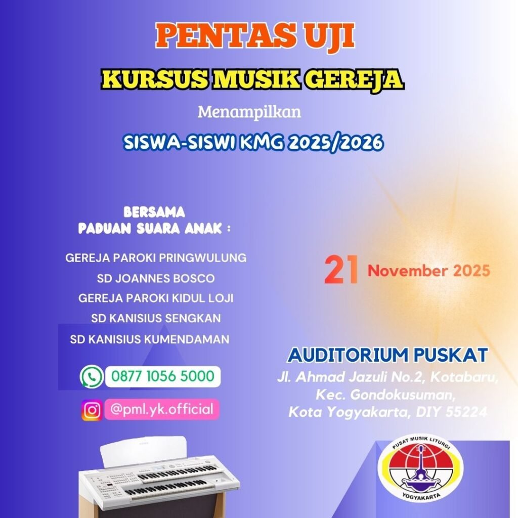 Bertempat di Auditorium Gedung Puskat Jl. Ahmad Jazuli 2 Yogyakarta, Jumat 21 November 2025 diadakan pentas uji para siswa KMG. Pentas ini guna menguji kemampuan siswa sesudah belajar selama tiga bulan. Dalam pentas kali ini siswa kursus, harus dapat membina murid SD wilayah sekitar Yogyakarta yang telah dipilih, untuk dilatih kor oleh para siswa Kursus Musik Gereja (KMG) dengan dua lagu yang telah disiapkan. Hasil pendampingan dengan siswa SD tadi untuk dipentaskan di depan penonton sebagai bahan untuk penilaian siswa KMG di Triwulan pertama.