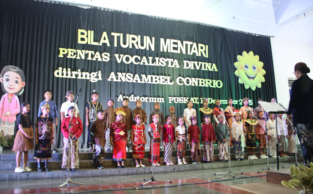 Paduan suara anak Vocalista Divina menggelar pentas menyongsong perayaan Natal bertajuk Bila Turun Mentari di Auditorium Pusat Kateketik (Puskat) Yogyakarta, Sabtu (13/12/2025). Pentas ini menampilkan kolaborasi istimewa antara paduan suara anak dengan ansambel gamelan Jawa.
